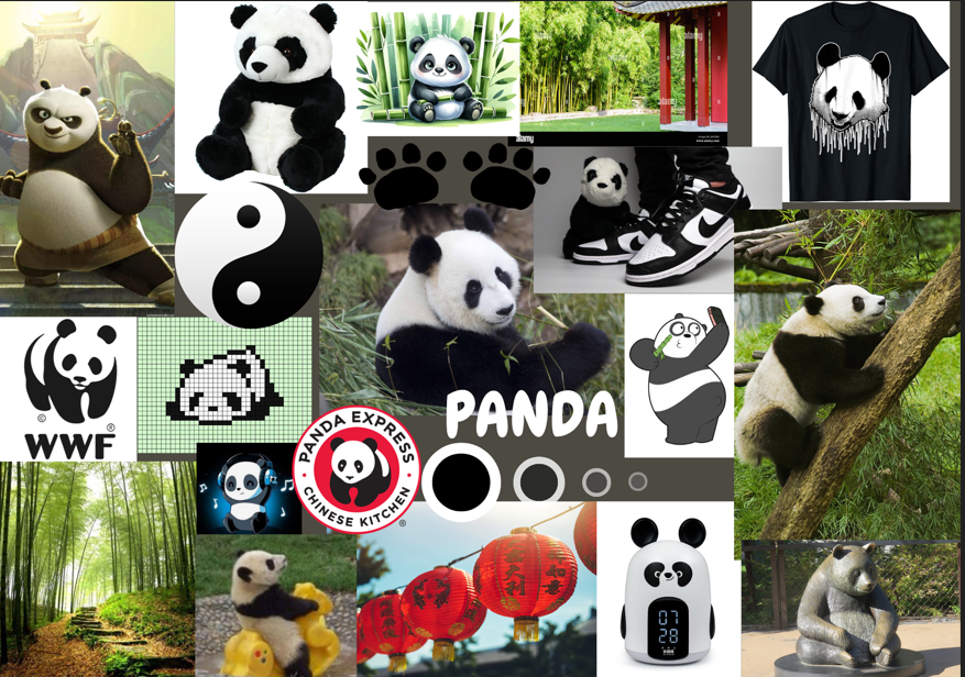 J’ai d’abord hésité entre l’écureuil et le lion, mais j’ai finalement choisi le panda, un animal dont les caractéristiques visuelles sont immédiatement reconnaissables. Le premier moodboard met en avant son environnement naturel en Asie, son régime alimentaire (notamment le bambou), et des représentations illustrées.